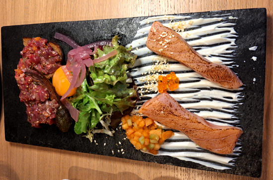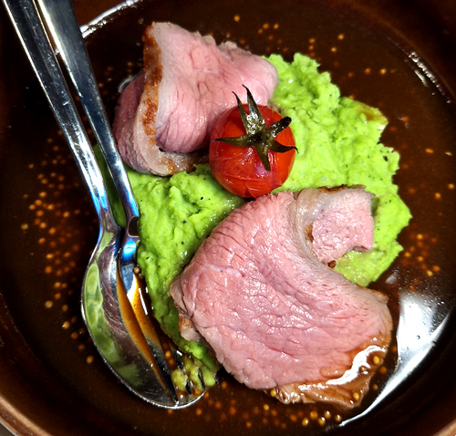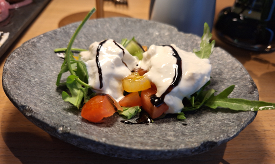 Die Vorspeise kam mit 'Sommersalat' liebevoll angerichtet daher und erwies sich als munterer Opener: Es gab zarten Beizlachs geflämmt, auf geeister, aber ansonsten langweiliger Limonen-Olivencreme. Zudem köstlichen Burrata auf Vierländer Tomaten sowie eine nette Tatarstulle mit gebackener Kapernapfel und confiertes Eigelb. Allerdings unterscheidet sich ein gebackener Kapernapfel kaum von eingelegtem.