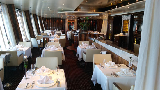 Optisch unterscheidet sich das Restaurant nicht von den Rossinis auf den Schwesterschiffen, nicht einmal der Seeblick fehlt. Allerdings ist 'optisch' in diesem Falle das Stichwort. Während die Köche auf den anderen Schiffen (Luna, Sol) dem Sterneniveau durchaus sehr nahe kamen, gelang dies der Crew um Felix Hellmann nur hinsichtlich des wirklich ansprechenden Äußeren der Gerichte. So kamen die Menüs einfach nicht rund genug an den Tisch. Das lag nicht an den bemerkenswert ausgesuchten Hauptzutaten, denn Fisch (Kabeljau, Heilbutt, Dorade) und Fleisch (Lamm, Ochse, Hirschkalb, Wachtel) kamen in zarter, allerfeinster Produktqualität und wohlgegart auf die Teller. Die Ursache war in den Beilagen zu finden, die zwar oftmals hübsch anzusehen waren (schwarzer Knoblauch), geschmacklich oder von der Textur her aber nichts brachten außer ein wenig Verdruss. Mutlos gewürzt, ohne jeden Pfiff, flach. Was soll im Februar ein Stück knallharter Spargel auf dem Teller? Und warum todlangweiliges, quasi aromafreies Gemüse als Sättigungsbeilage?