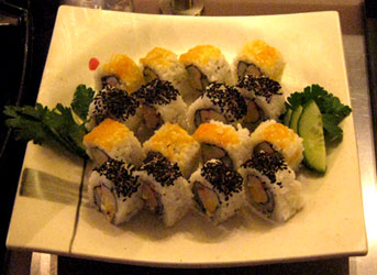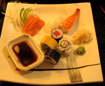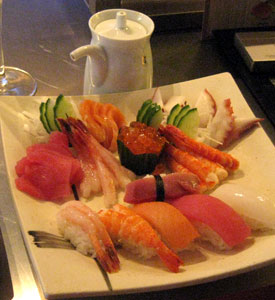 Jeder bekam dann etwa 10 Rollen Nigiri, Maki oder Sashimi, California Rolls, Algensalat (Wakame) - vom Feinsten! Dazu die übliche Tunke aus Sojasauce ('Kikkoman') und frisch angerührtem Wasabi sowie eingelegter Ingwer. Das Ganze schien herrlich frisch und aromatisch, der Koch vom 'Rossini' erklärte allerdings in entwaffnender Offenheit, dass es sich beim Fisch um getaute Ware handle, die man mit einem speziellen Verfahren taue. Davon war absolut nichts zu bemerken, besonders Oktopus und Thunfisch überzeugten die Zunge.