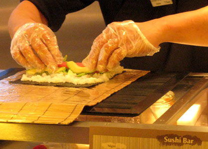 Einzig der Sushi-Kennlernkurs für 12,50 Euro inkl. Sekt war gut besucht, in erster Linie tatsächlich von echten Sushi-Neulingen. Der Sushi-Meister zeigte am Tresen in vollkommener Ruhe seine Kunst, fertigte die präzisen Rollen, alles sah wunderbar schnell und einfach aus.