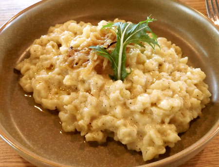 recht schmackigen Hofknöpfle mit Backensholzer Käsen und Schmorzwiebeln