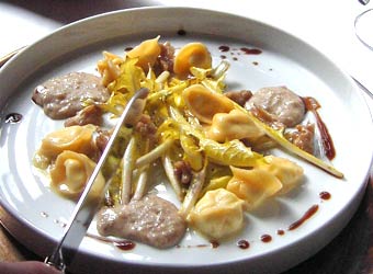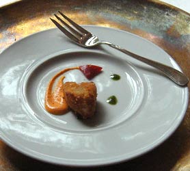 Die Speisekarte selbst hatte ich zunächst mit gemischten Gefühlen studiert, kaum kräftige Fleischgerichte, dafür viel Geschmacksarmut verheißendes Vegetarisches. Als Gruß aus der Küche überzeugte dann aber sofort ein heißer, leicht panierter Nugget vom Hasen. Ebenfalls nicht zu verachten die Vorspeise, bestehend aus zweierlei Gazpacho mit gefülltem Calamaretti und Wassermelone - wenngleich eine Ajo blanco (kalte, weisse Suppe aus süßen Mandeln und Knoblauch) kaum unter den Begriff 'Gazpacho' passt. Dafür musste sich die kühle Köstlichkeit geschmacklich nicht hinter einer Ajo blanco verstecken, wie sie in Andalusien serviert wird. Zur Crème brûlée von der Entenstopfleber mit Pfefferkirschen und Brioche lässt sich nur ein einziges Wort sagen: Grandios! Besser abgestimmt und runder auf der Zunge geht es kaum. Die Vorspeisen schlugen mit jeweils 15,- Euro zu Buche.