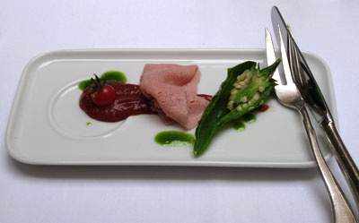 Immerhin adelt der Gault Millau 2010 das Berliner VAU mit 17 von 20 möglichen Punkten, da schien es uns angemessen, in dem sehr nett am Gendarmenmarkt gelegenen Restaurant auch für den Mittagstisch zu reservieren. Die Vorsichtsmaßnahme erwies sich als unnötig, denn mitten in der Ferienzeit war kaum ein Drittel der Plätze besetzt - und im Innenhof wegen dunkel dräuender Regenwolken nicht eingedeckt.