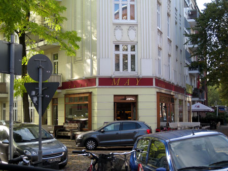 Ein Vormittag Mitte Oktober 2014. Nach einem zweiten Frühstück stand uns der Sinn und wir fanden, dass die günstigen Kuchen und Torten recht einladend aussahen. Das ziemlich verwinkelte Cafe May war kurz vor der Mittagszeit sehr gut besucht, wir bekamen gerade noch einen freien Tisch im hinteren Bereich. Es entsteht schnell der Eindruck, dass dieser Laden für viele Gäste eine Art zweites Wohnzimmer ist, man trifft sich, man liest die Tageszeitung, alle Altersgruppen sind vertreten. Eine Tischbedienung gibt es hier nicht, man bestellt und bezahlt auch sofort am Tresen.