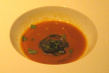 eine Nocke aus Tomaten-Basilikum-Moussee mit etwas Balsamico serviert,