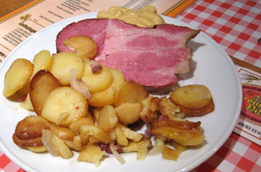und Kartoffeln sind knapp 10 Euro fällig, Krustenbraten und Würstchen