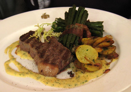 Beispiel Spargelsüppchen, Entrecôte mit Bohnen, Bratkartoffeln und