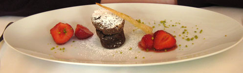 Estragonsauce sowie ein warmes Schokoküchlein mit marinierten Erdbeeren