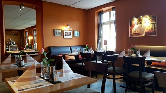 Das Klassenzimmer ist Teil einer weitläufigen Anlage, bestehend aus Restaurant mit mehreren Räumen (ehemaligen Klassenzimmern) und angeschlossenem Hotel.