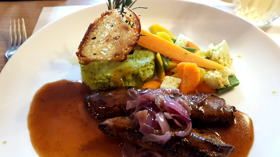 Der Hauptgang:"Weidelammfilets mit Rotweinsauce, Grillschalotten, Marktgemüse und Zuckererbsen-Püree" war ebenfalls tadellos und von solidem Geschmack. Zartes Lammfleisch mit passend kräftiger Rotweinsauce und fein abgeschmecktem Gemüse bzw. Kartoffel-Zuckererbsen-Püree.