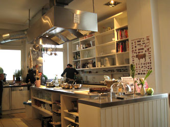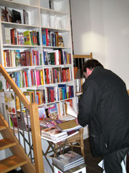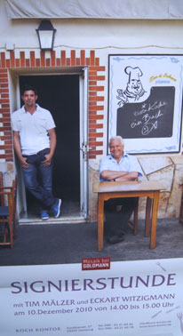 Wer das Kochkontor betritt, wähnt sich zunächst in einer Buchhandlung, denn der Vorraum steht voller Regale mit Büchern - Kochbüchern. Die guten Stücke, Mainstream wie auch Exotisches, können käuflich erworben werden, aber die Küche selbst pflegt auch eine enge Beziehung zu den Werken. Bei unserem ersten Besuch stellte Stevan Paul sein amüsantes, aus vielen persönlichen Erfahrungen gespeistes Buch vor ('Der Hummer Monsieur und ich') und die Köche servierten dazu drei der dort erwähnten Gänge, hochklassig und schmackhaft. Wie mir der Genusspapst glaubhaft schilderte, sollen auch die Kochkurse einen Versuch wert sein, er schwärmt seit Jahren vom 'Katalanisch Kochen'.
