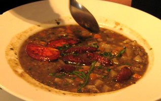 Leicht süß-säuerliche Anklänge schoben sich bei der Linsensuppe in den Vordergrund und bildeten einen gelungenen Kontrast zu den angebratenen Chorizoscheiben. Gut, wenngleich nicht genial. Als Nachtisch bestellten wir gedeckten Apfelkuchen, der zwar recht trocken aussah, sich aber dann doch - auch ohne Sahne - erfreulich gut schlucken ließ.