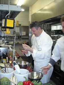 Lehrreich und amüsant gestalten sich die Kochkurse im Landhaus Scherrer. Sie finden an Tagen mit normalem Betrieb statt, so dass neben den Kursteilnehmern auch die übliche Küchenbrigade an Tischen und Herden werkelt. Safety first: In meiner privaten Küche kenne ich keine Hemmungen, wenn es darum geht, Rührschüsseln oder dergleichen aus Porzellan oder Glas zu verwenden - ich habe mir nicht einmal Gedanken darum gemacht. Ganz anders in dieser Profilküche, die erwähnten Materialien finden schlicht keine Anwendung. Wenn etwas abbrechen oder splittern würde, wäre das Risiko, dass etwas davon auf dem Teller des Gasts landet, einfach zu groß. Daher bestehen sämtliche Schüsseln/Gefäße aus Edelstahl. Besonders interessant fand ich, als ein Kurs etwas verspätet begann und darum noch nicht zu Ende war, als die ersten Gastbestellungen ankamen: Absolute Ruhe, absolute Konzentration, jeder wusste, was er zu tun hatte, acht Appetizer waren in Turbogeschwindigkeit bereitet - beeindruckend.
