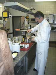 Die Kochkurse finden in der Redaktion 'Essen & Trinken statt, im Redaktionsgebäude von Gruner & Jahr. Der Saucenkurs ging über zwei volle Tage - und man sah nicht einer Koryphäe über die Schulter, nein, selber schuften war angesagt. Entsprechend hoch der Lerneffekt. Grundlagen für einen feinen Fond: