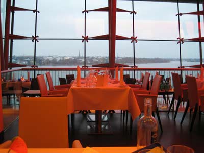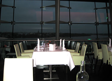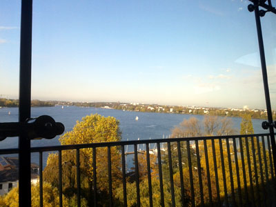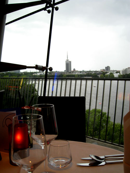--- Die Lage des Restaurants ist ja einfach spektakulär, man fährt mit dem gläsernen Außenfahrstuhl nach oben und genießt dann einen umwerfenden Blick über die Alster.