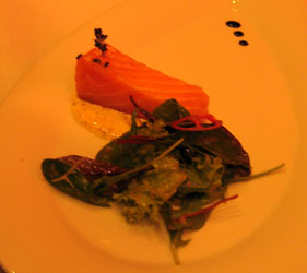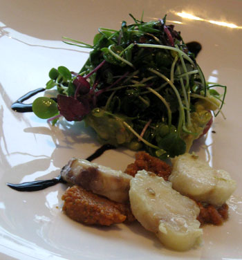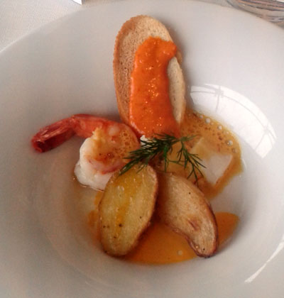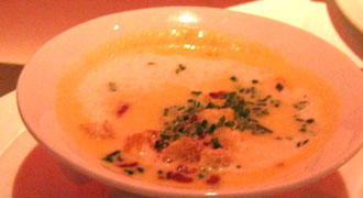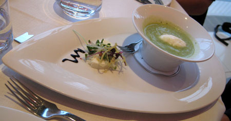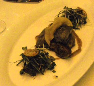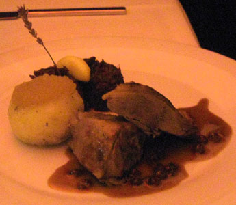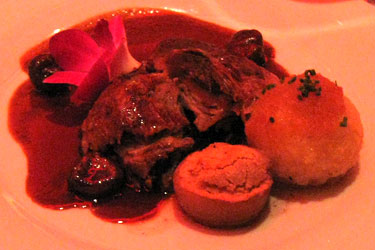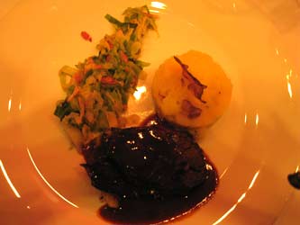 Selbst Salatfeinde dürften hier zu Konvertiten werden, diese wunderbare Komposition von kräftig-zartem Gänsefleisch mit zurückhaltenden Fruchtaromen dürfte auch skeptische Gaumen überzeugen. Es folgte zum gleichen Wein eine sehr, sehr samtige Kartoffelvelouté mit Speckcroûtons: