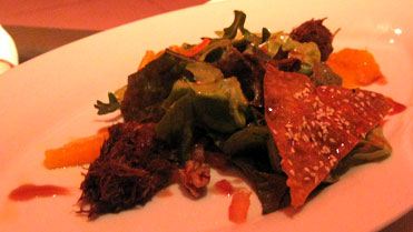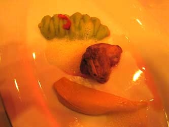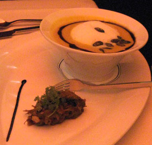 Den gleichen Wein gab es zum Kürbis-Orangen-Crèmesüppchen samt Gänseklein, da passte er so einigermaßen, man hatte sich an ihn gewöhnt. Die samtige Suppe, die wie ein Milchkaffee aussah, glänzte nämlich ebenfalls mit verhaltener Süße. Sehr unspektakulär, aber besonders lecker, feinfaserig und aromatisch kam das Gänseklein daher - insgesamt ein gelungener Gang.