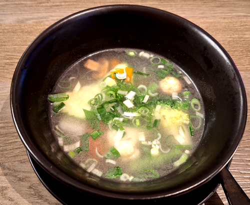 Vorweg gibt es nach Wahl eine Suppe oder einen Salat, wir haben uns für
