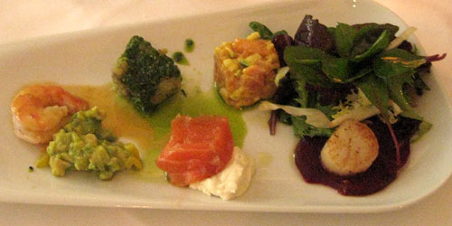 abwechslungsreicher Teller mit Jokobsmuschel, Lachs und anderen frischen