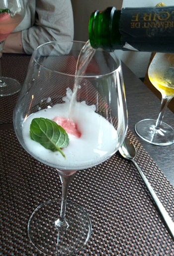 Erdbeersorbet, das der Chef mit kraftvollem Cremant aufgoss - große