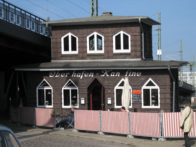 Zufällig kommt an dieser letzten Kaffeeklappe niemand vorbei, wenn er nicht gerade als Hafenarbeiter schafft. Von einer riesigen Baustelle (Hafencity) umgeben und auch sonst nicht leicht erreichbar, finden sich hier in erster Linie Touristen ein oder Zeitgenossen, die Lust auf etwas Originelles verspüren. Beim Betreten des in sich völlig schiefen Gebäudes kommt sofort Seekrankheit auf, es scheint keinen einzigen rechten Winkel zu geben. Aber bei schönem Wetter kann man auch draußen sitzen, allerdings müssen Gespräche wegen der alle paar Minuten vorbeipolternden Züge und Laster oft unterbrochen werden.