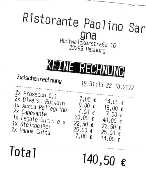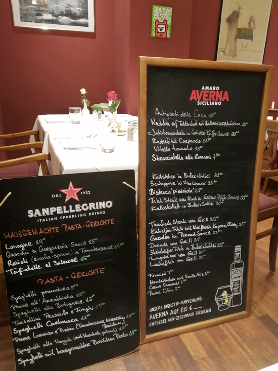--- Während Patron Paolino im Oktober 2022 auf Sardinien weilt, führt offenbar seine Tochter das Restaurant weiter. Allerdings gibt es nun keine Öffnung mehr zur Mittagszeit und auch keine gedruckte Speisekarte mehr. Letzteres ist besser zu verschmerzen, jetzt werden die Gerichte liebevoll auf handbeschriebenen Tafeln präsentiert.