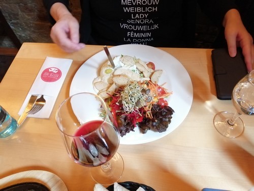 Allerdings überzeugte die Unterlage nicht so recht, weil alles gleichmäßig (zu) säuerlich daherkam, schade. Ob es sich um Convenience handelte? Der Verdacht erhärtete sich, als am Nebentisch gefragt wurde, ob man Zwiebeln und Knoblauch weglassen könne. Könnte man nicht, es handle sich schließlich um 'fertige Mischungen', hieß es. Da blieb nur ein Salat.