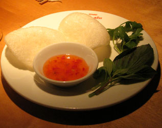 Vorweg gab es zwei Krabbenchips mit Thaibasilikum, Koriander und einer