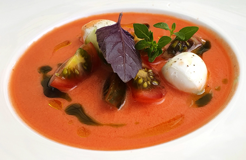 Küche bekamen wir eine kalte, würzige Tomatensuppe:
