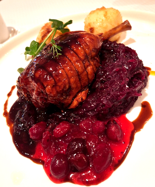 auf der Speisekarte, ist die ‚krosse Vierländer Ente mit Spitzkohl,