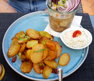 Portion Butterkartoffeln und der fein abgeschmeckte Gurkensalat zeigten