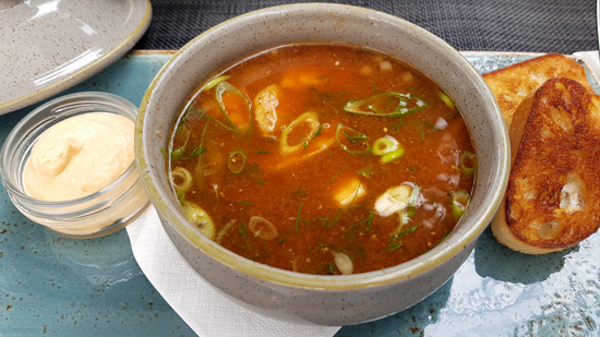 geröstetem Brot und sehr schmackhaften Rouille serviert wurde. Zwar