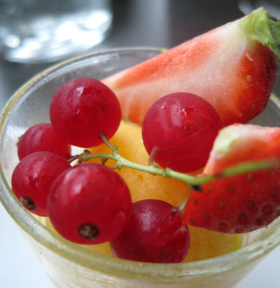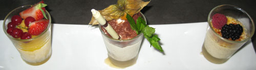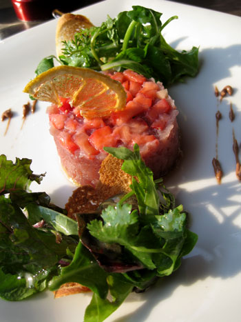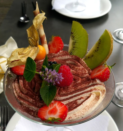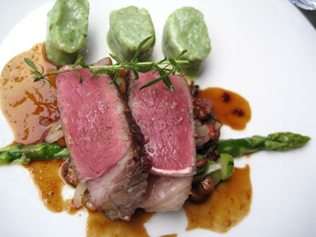 Es gehört schon eine Portion Mut dazu, angesichts von gut 36°C im Schatten Thunfischtatar zu servieren, dieses kam sehr gut gekühlt und bemerkenswert frisch daher. Die an sich originelle Idee, Fisch mit Erdebeeren zu mischen, hätte mit ein wenig mehr Mut den Sprung zur Genialität geschafft - so fehlte es ein wenig an Schärfe, da halfen auch einige knapp bemessene Kleckse der Schoko-Chili-Mayonnaise nicht.