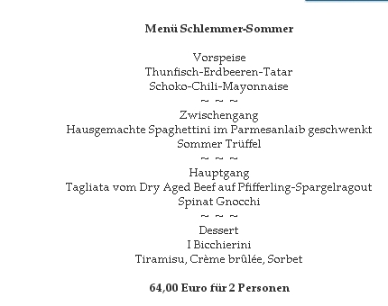Wie der Name schon vermuten lässt, residiert dieser Edel-Italiener in einem ehemaligen Hafensilo, man sitzt sehr nett an sehr kleinen Tischen und kann den Blick aufs Wasser genießen. Wir baten um einen Grauburgunder und wurden belehrt, dass man ausschließlich italienische Weine führe - einen Pinot Grigio bot man uns aber nicht an. Stattdessen gab es einen ordentlichen Lugana 'Bulgarini'. Die Speisekarte erfreut mit Übersichtlichkeit - wir wählten das Schlemmersommer-Menü 2015: