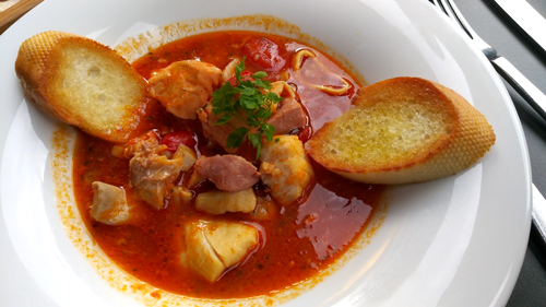 --- Wenn man in der näheren Umgebung tatsächlich einen freien Parkplatz findet, ist auch der Mittagstisch eine Empfehlung wert. Im August 2017 probierten wir die gehaltvolle 'Ligurische Fischsuppe mit Crostini' (10,50 €), die mehr aus zarten Fischfiletstückchen als aus der tomatigen Suppe bestand. War das Ganze durchaus ansehnlich auf den Tellern drapiert und schmackhaft, so ging es doch kaum ohne den Pfeffer aus der gereichten Mühle.