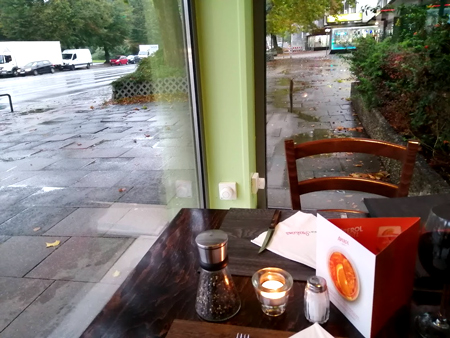 Der Tisch birgt, neben dem uncharmanten Blick auf die sechsspurige