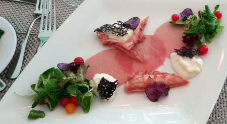 Die Vorspeise überzeugte optisch, der lauwarme Pulpo mit dem sehr milden Wasabischaum auch geschmacklich, ebenso die bunten Winztomaten im Salat. Das nett anzusehende Carpaccio vom Thunfisch allerdings erwies sich als salziges, auswässerndes Glubschdesaster - möglicherweise unsachgemäß getaute Ware. Einfacher und gut gemeinter Lösungsvorschlag für die Küche: Carpaccio unbedingt weglassen!