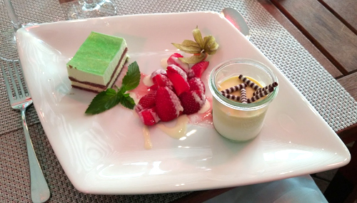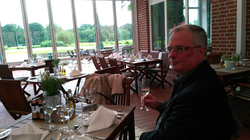 Wir saßen sehr entspannt im Wintergarten, mit Blick auf den Golfplatz. Das Bistro war ausgebucht, unser Restaurant nicht und so hatten wir es mit bestens gelauntem Personal zu tun, das Zeit für uns hatte. Die Getränkepreise hielten sich im erwarteten Rahmen, für trockenen Sherry wurden 5,50 € aufgerufen, für 0,25 l vom ordentlichen Merlot 8,- €.