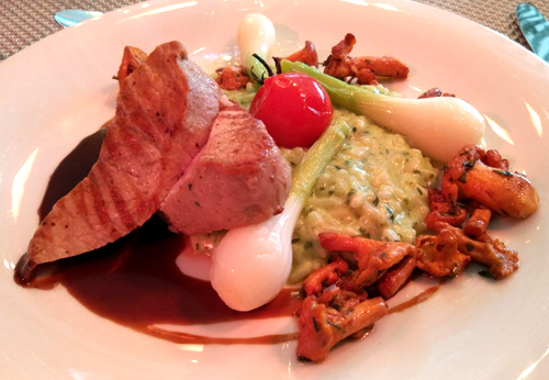 Ohne jeden Tadel bleiben die gleichmäßig rosafarbenen, wunderbar saftigen und dabei vollmundigen Tranchen vom Kalbsrücken - riesige Teile übrigens. Halbwegs schlotziges Bärlauchrisotto drohte, das filigrane Kalbfleischaroma mit seiner Würzigkeit zu erschlagen, ebenso die für sich genommen erstklassigen Frühlingszwiebeln. Zusammen mit den auf den Punkt gegarten Pfifferlingen brachte uns dieser Gang an den Rand des Fassungsvermögens.