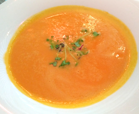 Sehr mächtig, aber von fein aufgeschäumter Konsistenz und recht aromatisch kam die Süßkartoffelsuppe mit pikanter Brunnenkresse auf den Tisch: