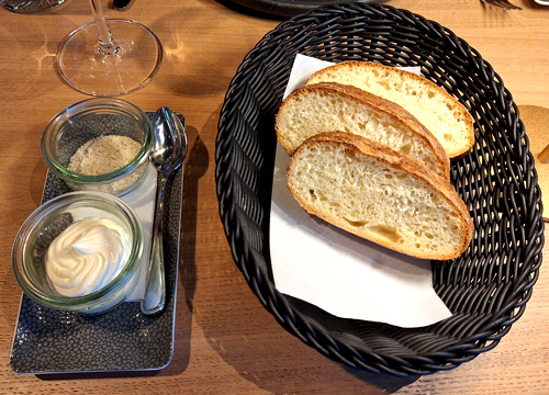 Die Vorspeise kam mit 'Sommersalat' liebevoll angerichtet daher und erwies sich als munterer Opener: Es gab zarten Beizlachs geflämmt, auf geeister, aber ansonsten langweiliger Limonen-Olivencreme. Zudem köstlichen Burrata auf Vierländer Tomaten sowie eine nette Tatarstulle mit gebackener Kapernapfel und confiertes Eigelb. Allerdings unterscheidet sich ein gebackener Kapernapfel kaum von eingelegtem.