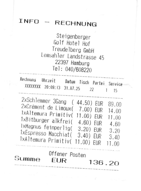 Zwar handelt es sich beim Treudelberg um ein gehobenes Hotel, einzelne Posten auf der normalen Speisekarte wirken allerdings nicht eben kundenfreundlich kalkuliert, z.B. Pimientos de Padrón mit Meersalz und Olivenöl für 12,00 €. Ernsthaft?