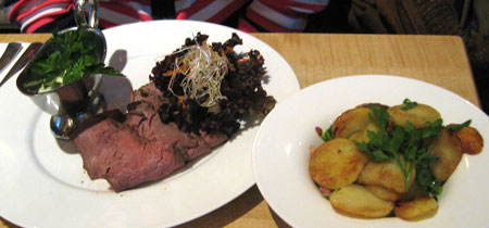 Etwas besser ging es mit dem Roastbeef, wiewohl mit den hervorragenden Bratkartoffeln ziemlich gegeizt wurde. Das Fleisch selbst war dünn geschnitten und von ordentlicher, sehnenfreier Qualität, jedoch nicht so wirklich zart. Zu lange gegart, nicht mehr rosa: