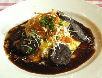 Kräftig nach Meerrettich duftend wurde 'Himmel und Erde' an den Tisch gebracht, die Blutwurst zeigte sich in Bestform, nämlich außen knusprig und innen butterzart. Kartoffelmus mit Röstzwiebeln war tadellos, Apfelmus angenehm stückig, jedoch eine Spur zu zuckrig - der Kurs von 9,90 ist angemessen: