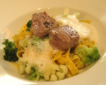 Dann das rosa gebratene Kalbsmedaillon mit Rosmarin-Tagliatelle und